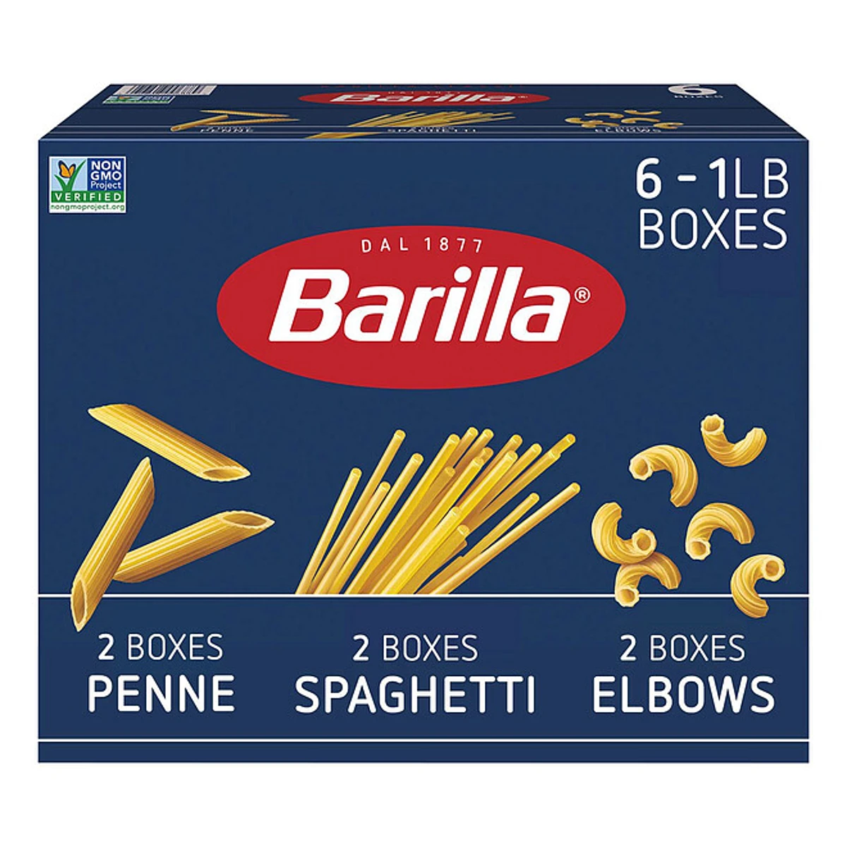 This bulk package holds six boxes of three different varieties of Barilla pastas_two elbow macaroni boxes, two penne pasta boxes and two spaghetti pasta boxes, for a total of about 48 servings of pasta. The pasta in this multipack are also an excellent source of vitamin B1, vitamin B3, vitamin B2, iron and folic acid and is suitable for vegetarians and vegans. Barilla pasta is low fat, cholesterol-free, sodium-free, trans-fat-free and provides a good amount of protein.