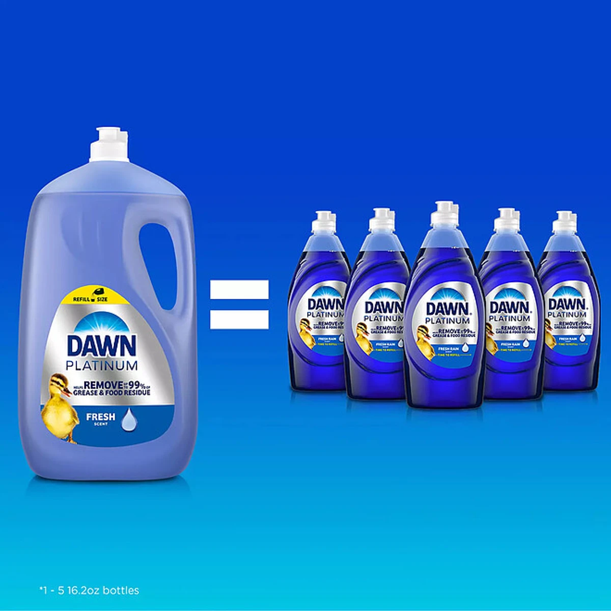 Your toughest, dirtiest everyday messes don’t stand a chance against the grease-fighting formula of Dawn Platinum Dishwashing Liquid Dish Soap, Refreshing Rain (90 fl. oz.). With 4X more grease cleaning power per drop,* Dawn Platinum’s formula is strong enough to power through everything from the greasiest and grimiest messes to even those baked-on, burnt-on, dried-on foods. This includes messes 48-hours old. And the power of Dawn Platinum liquid dish soap means less scrubbing and no more soaking.