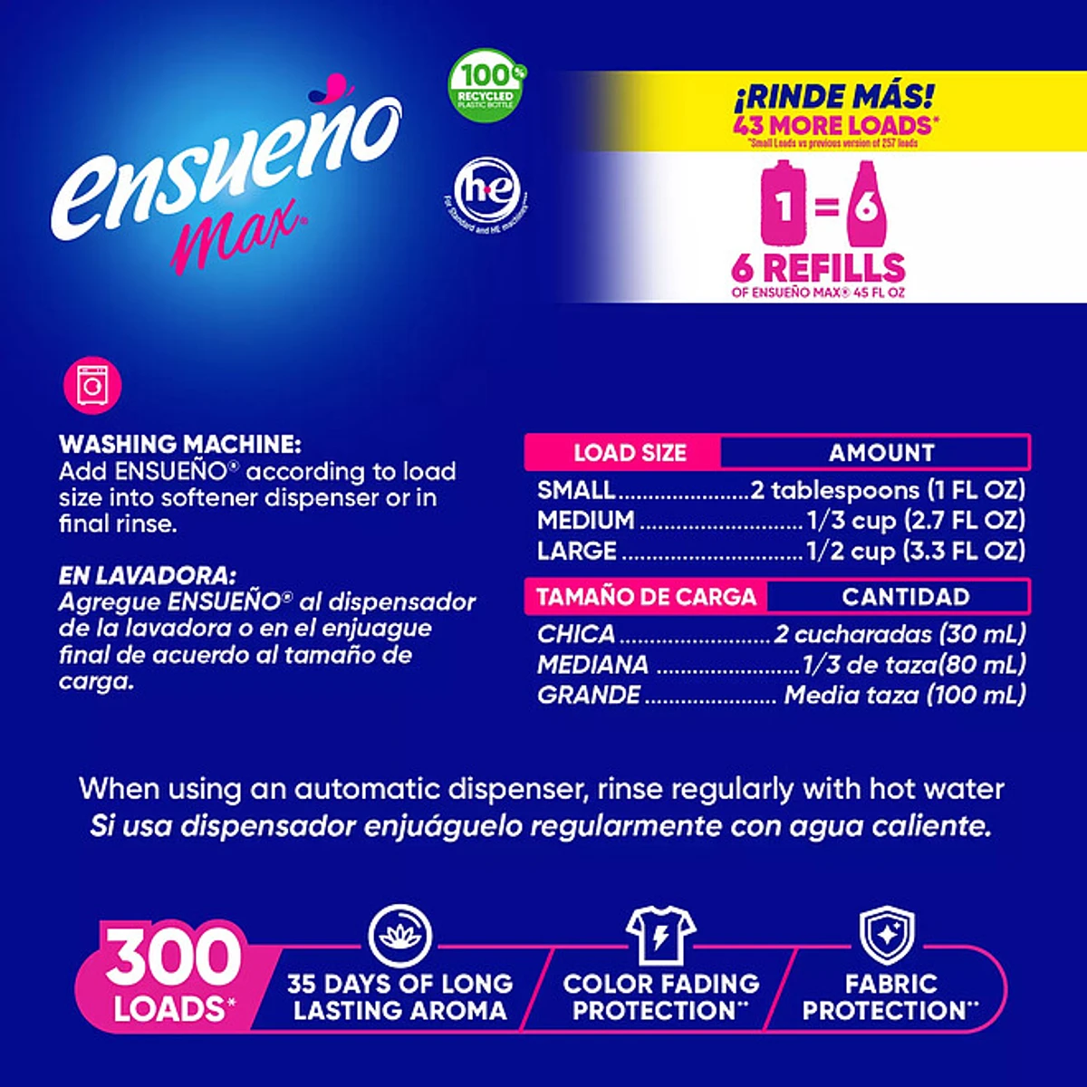 Ensueño Max Liquid Fabric Softener has a biodegradable formula that breaks down safely and quickly without harming the earth. It’s safe for standard and high efficiency (HE) washing machines.