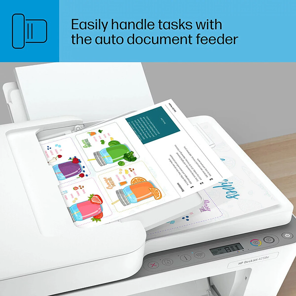 The leader for simple, stress-free printing, the HP DeskJet 4258e All-in-One Printer delivers color printing, 60-sheet paper capacity, and a 35-sheet auto document feeder for easy scanning and copying. Print up to 8.5 page per minute in black or 5.5 page per minute in color.