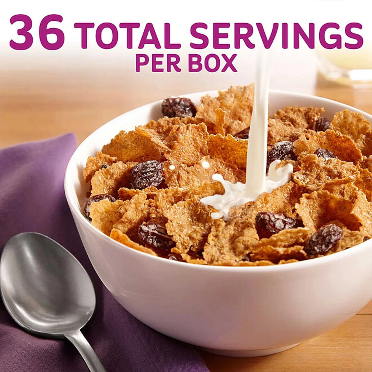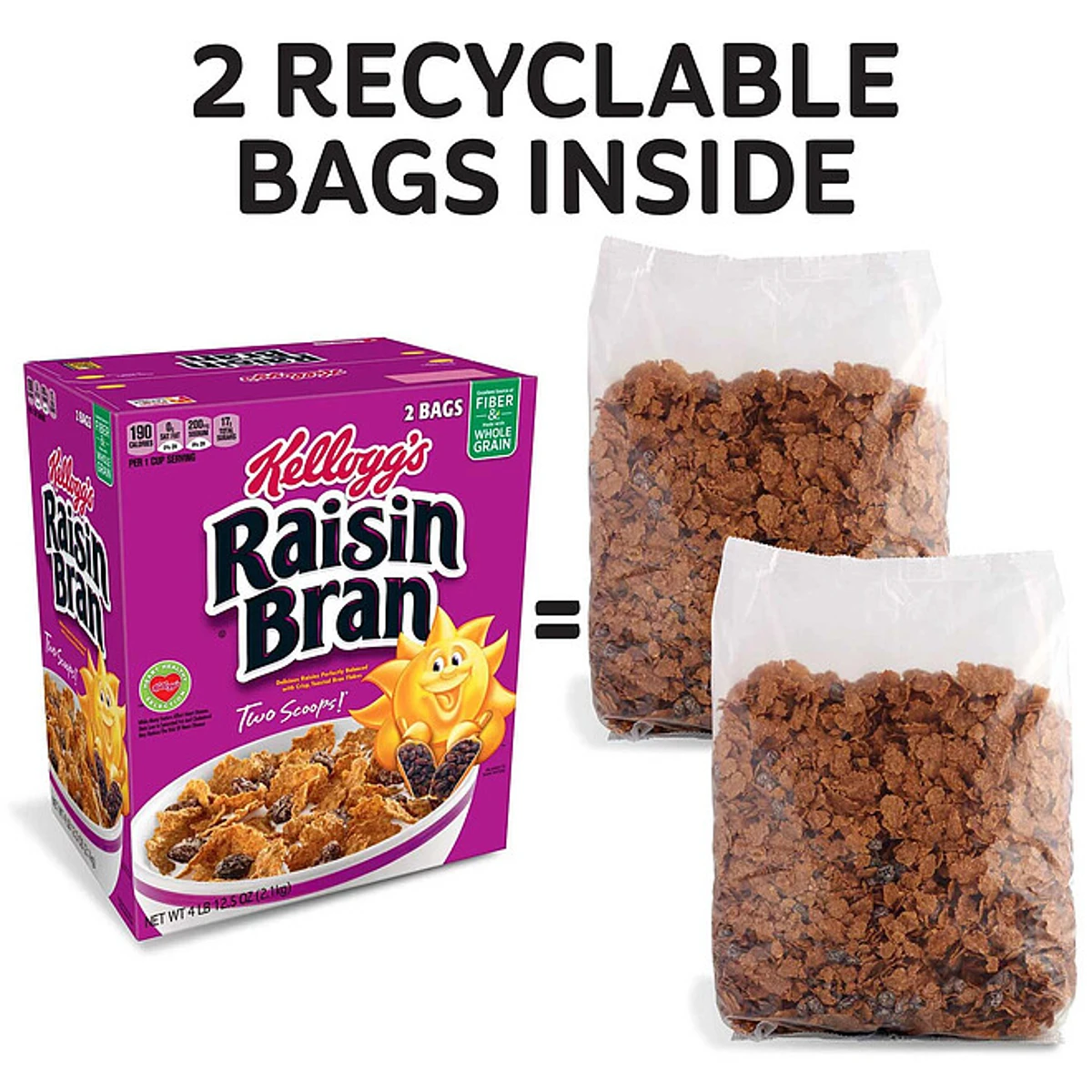 This extra-value box features two sealed bags of Raisin Bran cereal, ideal for everyday healthy breakfasts. Each bag yields approximately 36 servings. The bags are contained inside one recyclable box for easy storage and less waste. Start your day with the great taste of crispy, toasted bran flakes balanced with the goodness of sweet, delicious raisins.